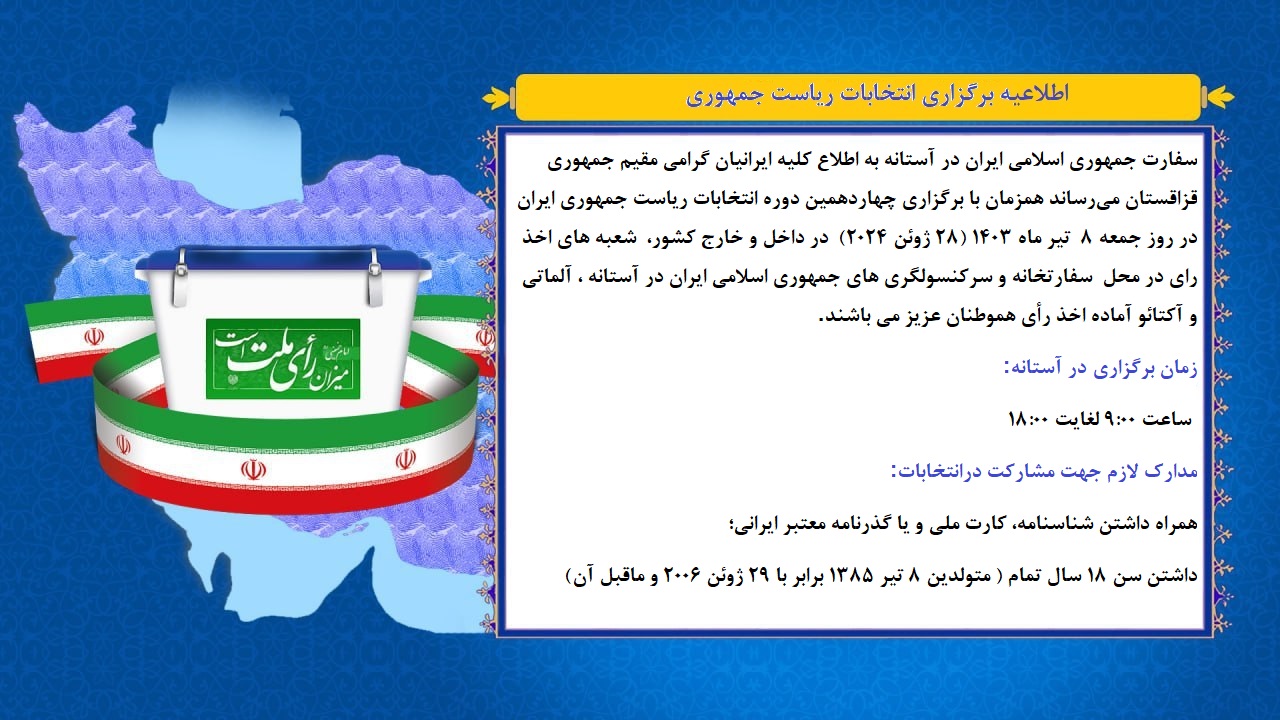 سفارت جمهوری اسلامی ایران در آستانه به اطلاع کلیه ایرانیان گرامی مقیم جمهوری قزاقستان می‌رساند همزمان با برگزاری چهاردهمین دوره انتخابات ریاست جمهوری ایران در روز جمعه 8  تیر ماه ۱۴۰۳ (28 ژوئن 2024)  در داخل و خارج کشور،  شعبه‌های اخذ رای در محل  سفارتخانه و سرکنسولگری‌های جمهوری اسلامی ایران در آستانه ، آلماتی و آکتائو آماده اخذ رأی هموطنان عزیز می‌باشند.